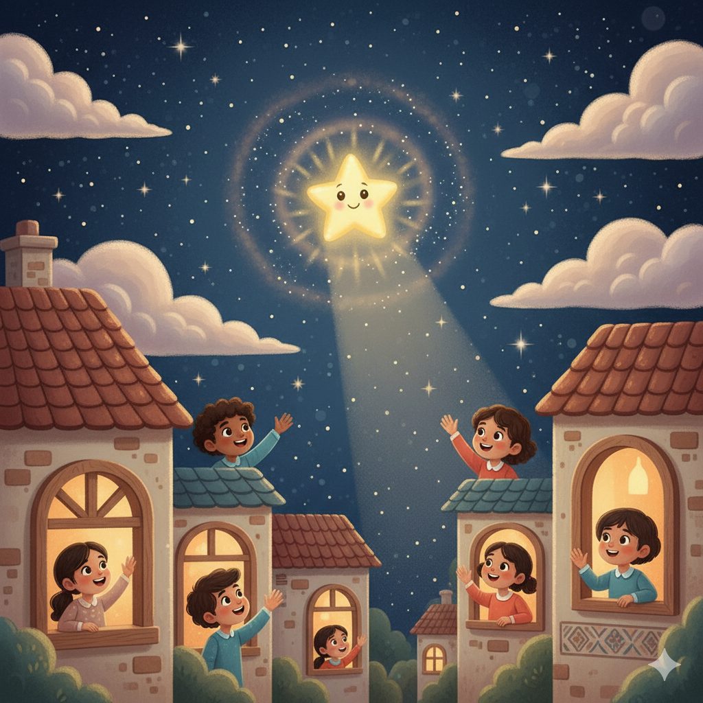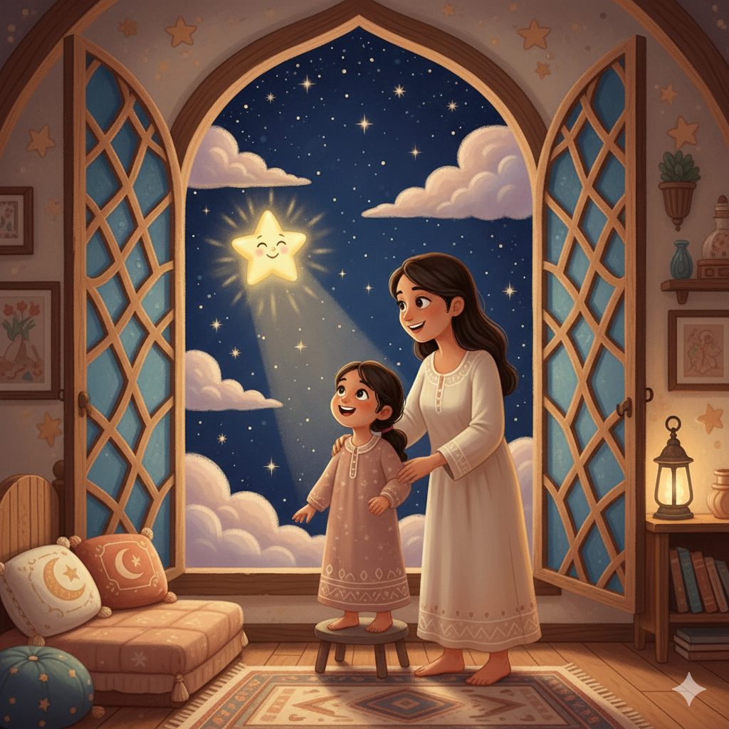 قالت ليلى بفرح: “انظري يا أمي! هناك نجمة صغيرة جميلة عند نافذتي! إنها تضيء لي!” جاءت أم ليلى ونظرت إلى النافذة وابتسمت. قالت الأم: “نعم يا حبيبتي، إنها نجمة خاصة جاءت لتحرسك الليلة.”